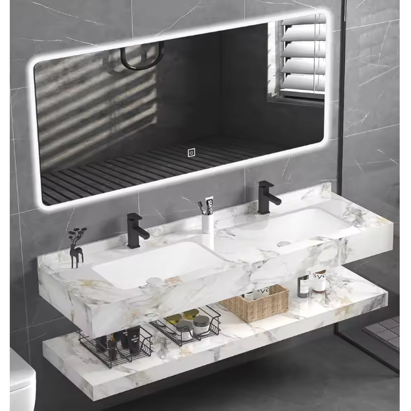 Çift havzalar lavabo vanity, tüm bakım ihtiyaçlarınız için geniş bir alan sunar, bu da onu daha büyük banyo alanları veya banyo paylaşan aileler için ideal bir seçimdir. LED ayna modern bir dokunuş katar ve tıraş, makyaj veya sadece güne hazırlanmak için geniş bir aydınlatma sağlar.